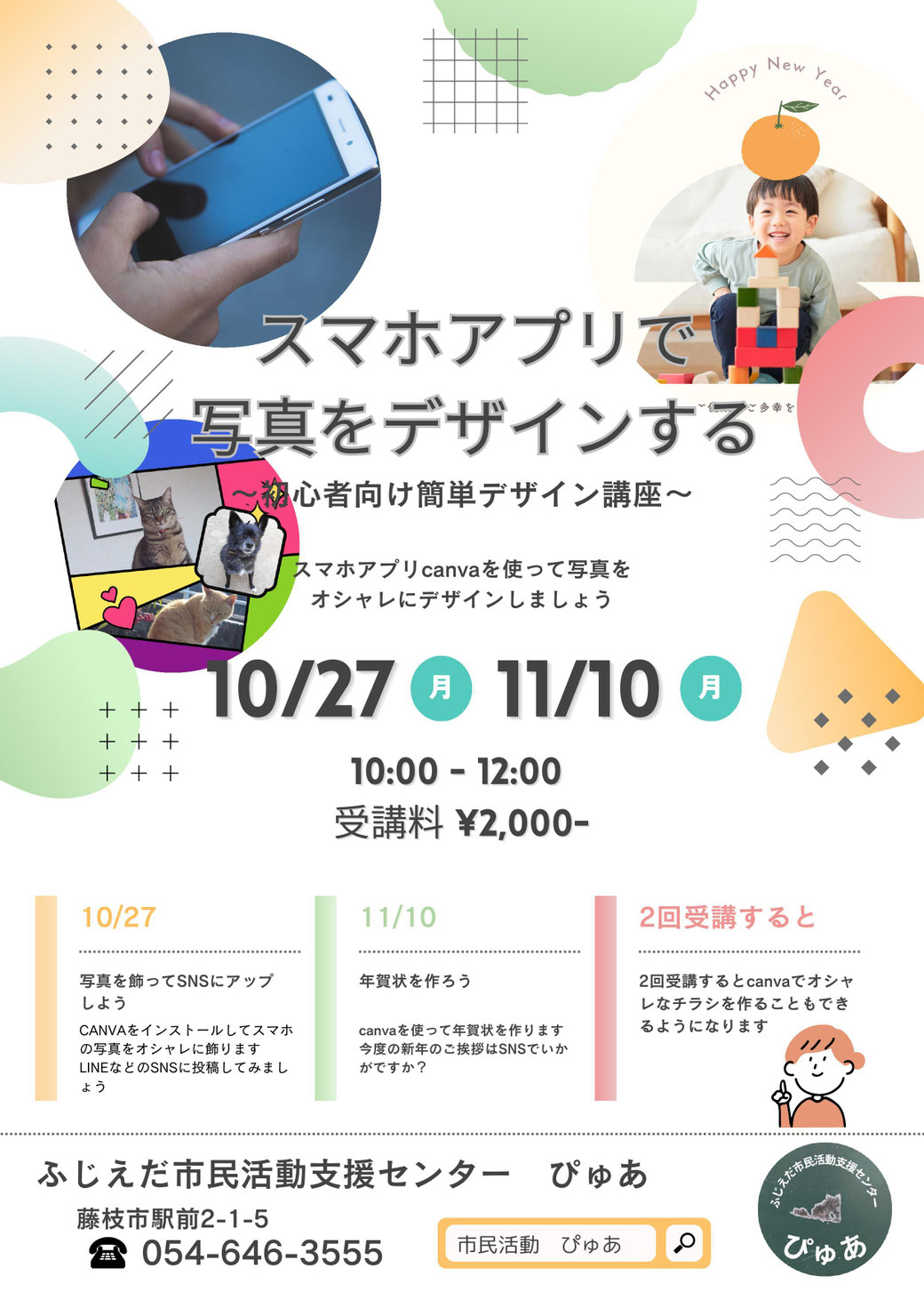 ふじえだ市民活動支援センターぴゅあ 電話646-3555まで(9:30~16:30) |